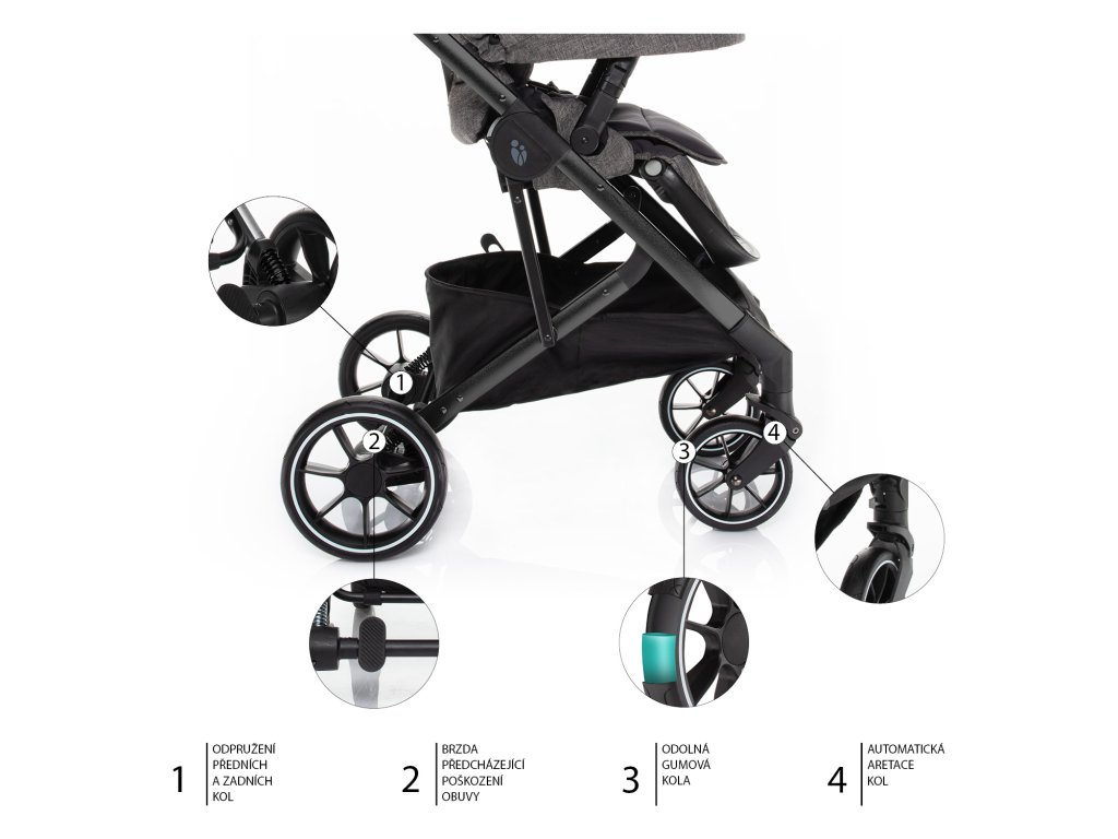 odolnými proti defektu. Všechna 4 jsou odpružená. Brzda se sešlapává shora,