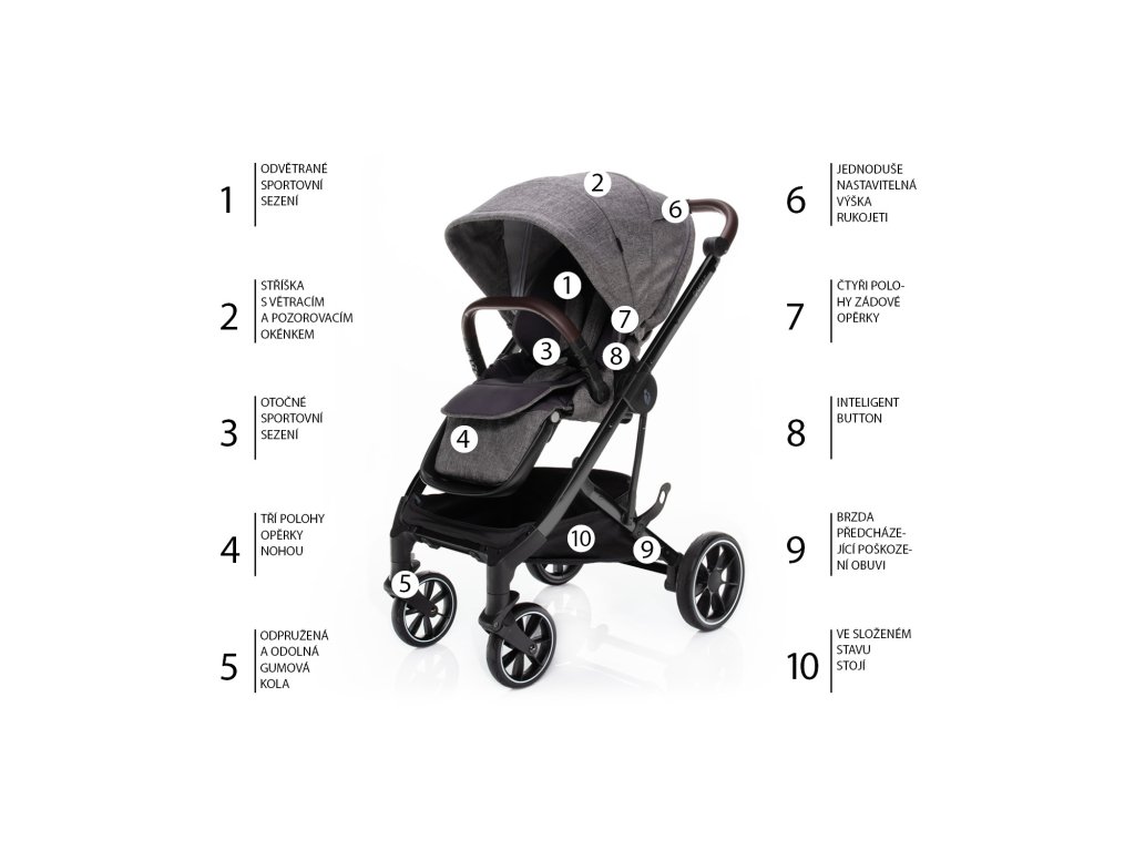 složeném stavu kočárek sám stojí a disponuje madlem na přenášení