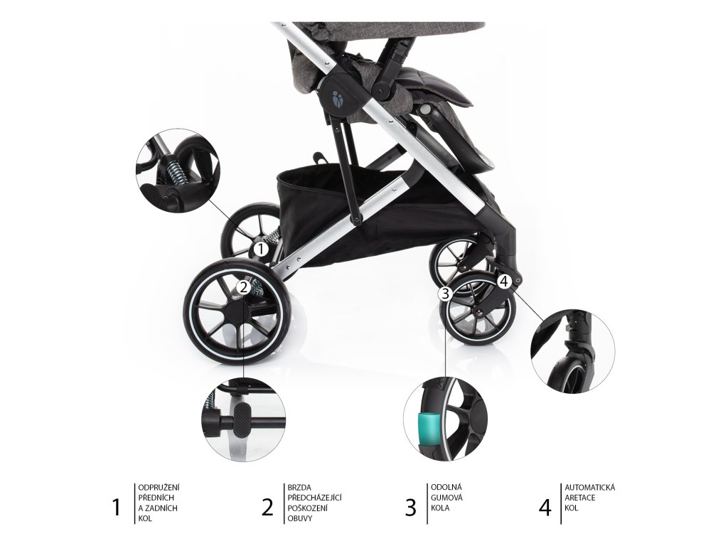 odolnými proti defektu. Všechna 4 jsou odpružená. Brzda se sešlapává shora,