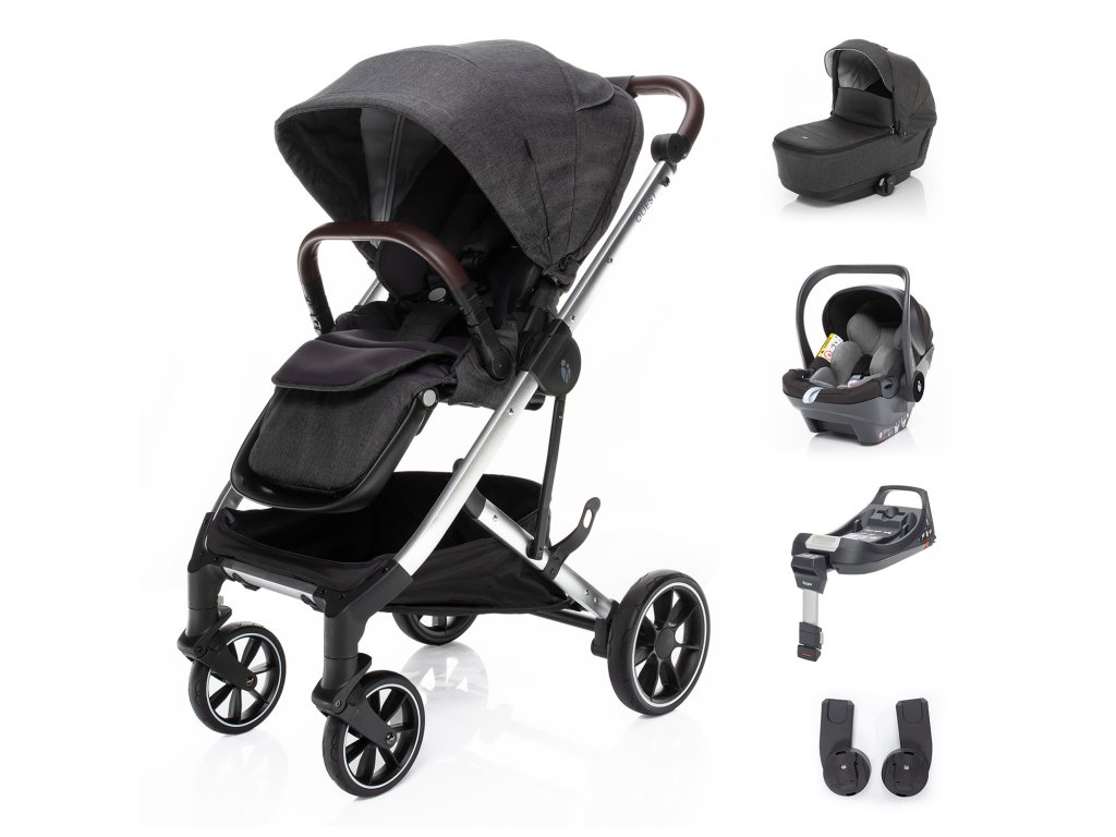 Součástí setu je podvozek se sportovním sezením, hluboká korba, adaptéry, autosedačka a isofixová báze na autosedačku.
