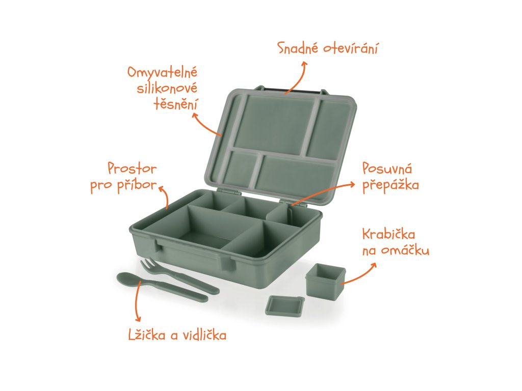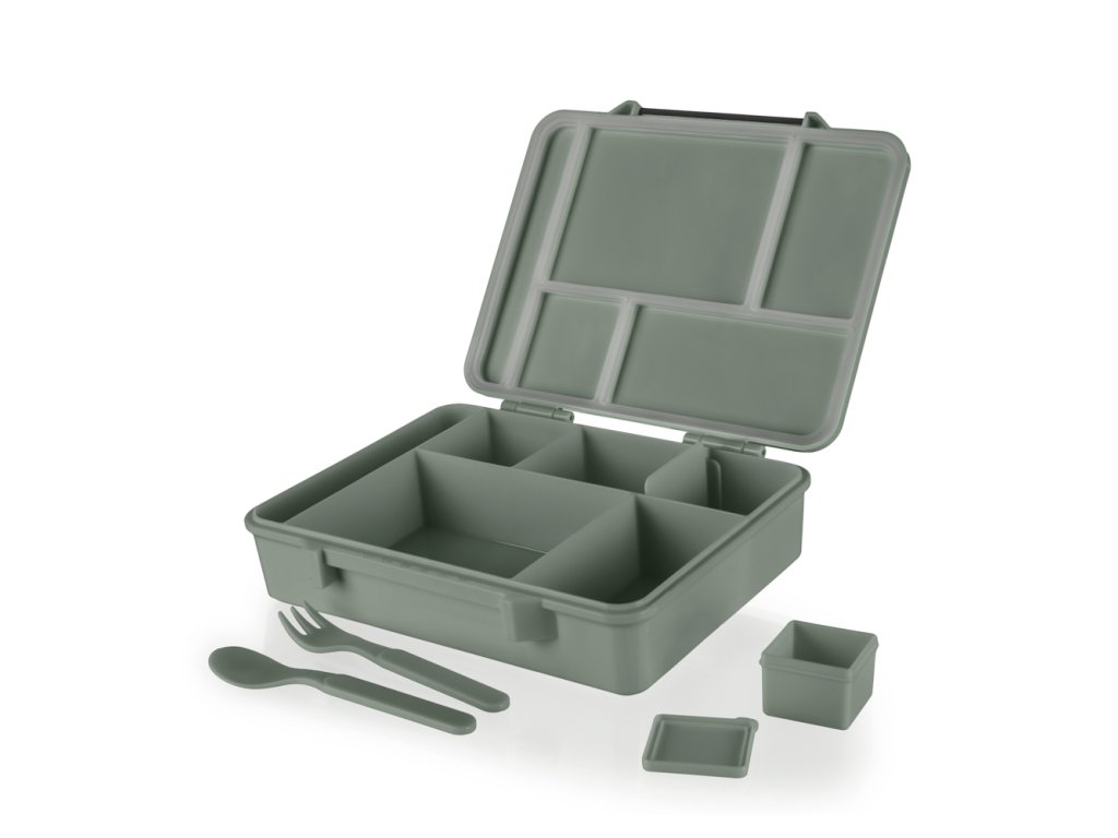 Díky několika prostorným přihrádkám různých velikostí (500 ml, 330 ml, 220 ml, 150 ml a 130 ml) můžete připravit pestrý a vyvážený oběd s sebou. Malá nádobka na omáčku a integrovaná vidlička se lžičkou jsou samozřejmostí.
