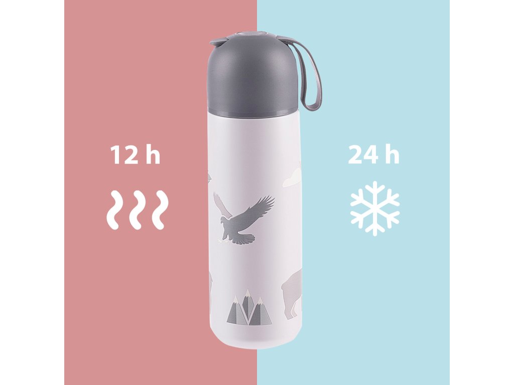 Kvalitní termoska na tekutiny o objemu 400 ml uchovává horké nápoje až 12 hodin, studené až po dobu 24 hodin. Je vyrobena z kvalitní nerezové oceli, která je odolná vůči korozi. Těsné víčko zajišťuje, že termoska neprotéká a vrchní uzávěr pro pohodlné nalévání se postará o to, abyste se nepolili ani při jízdě autem na nerovné cestě, taktéž si můžete být jisti, že se dítě neopaří tekutinou z termosky vzhledem ke dvojitému uzávěru. Víčko termosky lze použít jako hrníček.