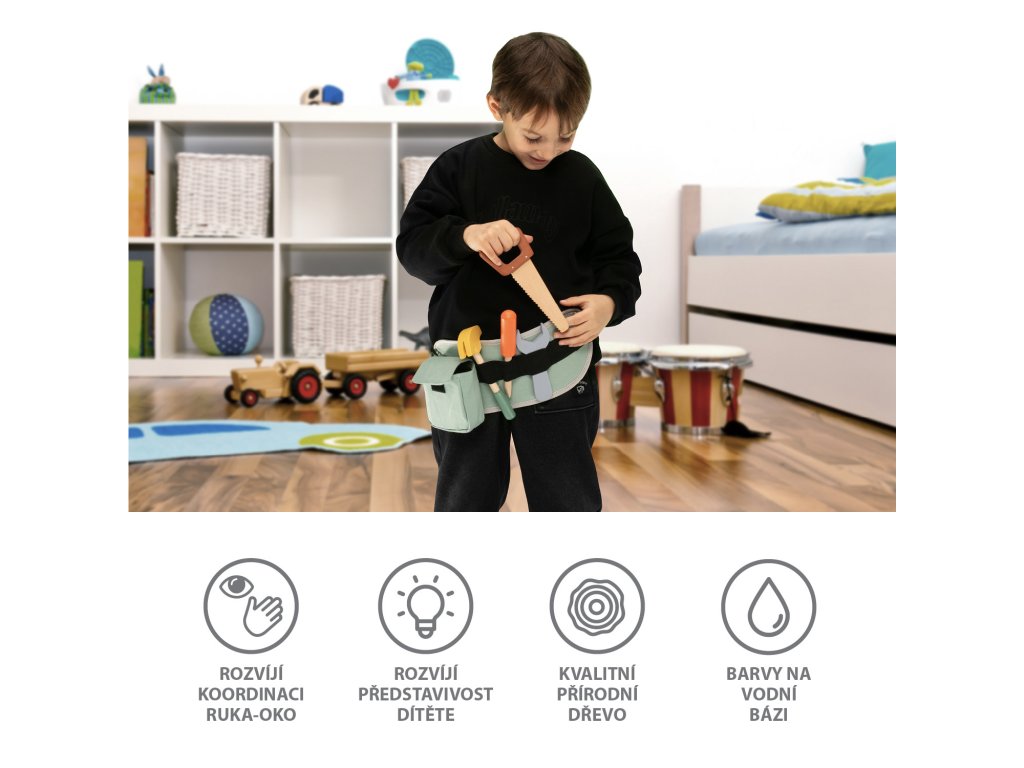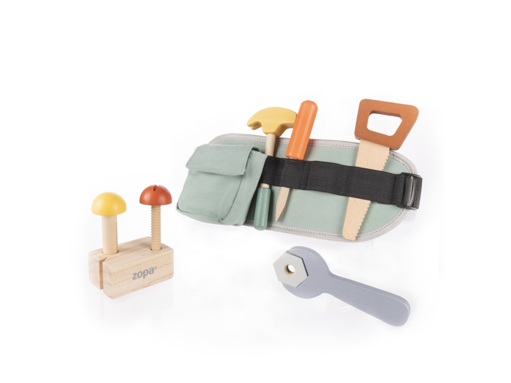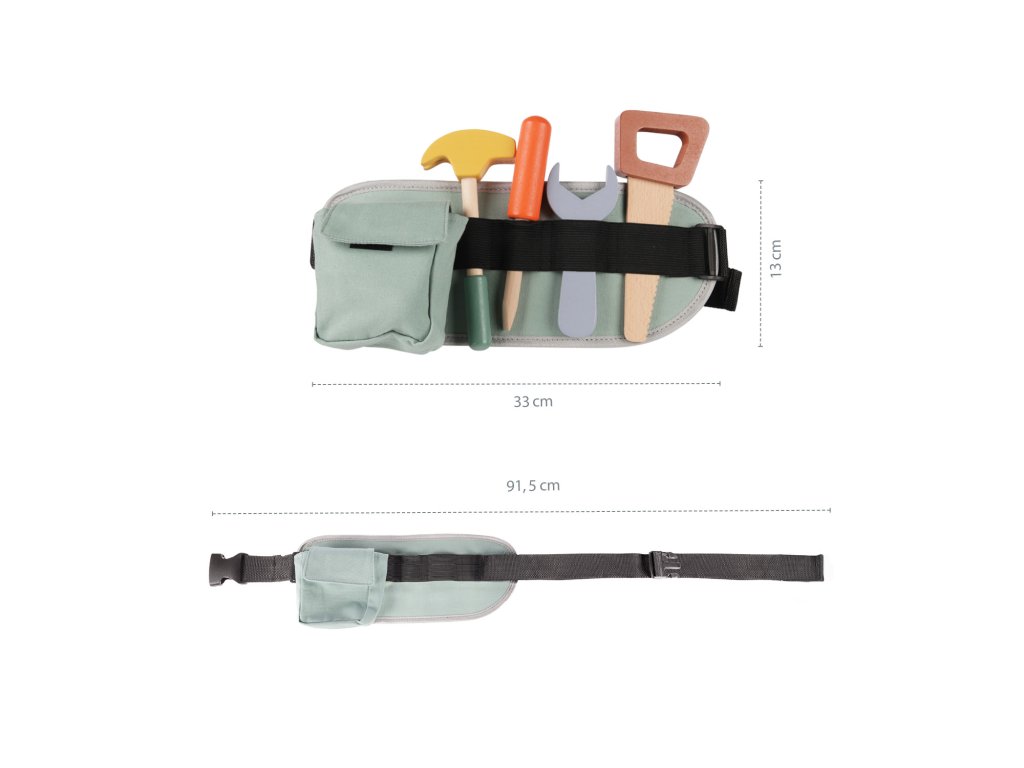 - Sada obsahuje: Textilní pás na nářadí a dřevěné nástroje (kladivo, klíč, šroubovák a další doplňky)